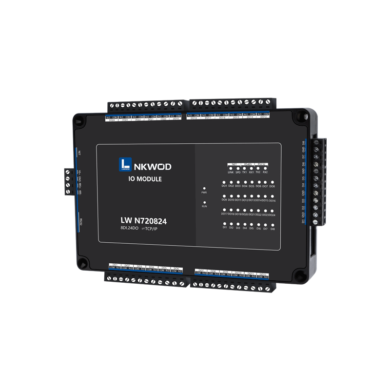 LW N720824为网络型智能数字量采集器,具有8路干接点数字量输入(DI)和24路A型继电器输出数字量(DO); 设备同时带有一个
