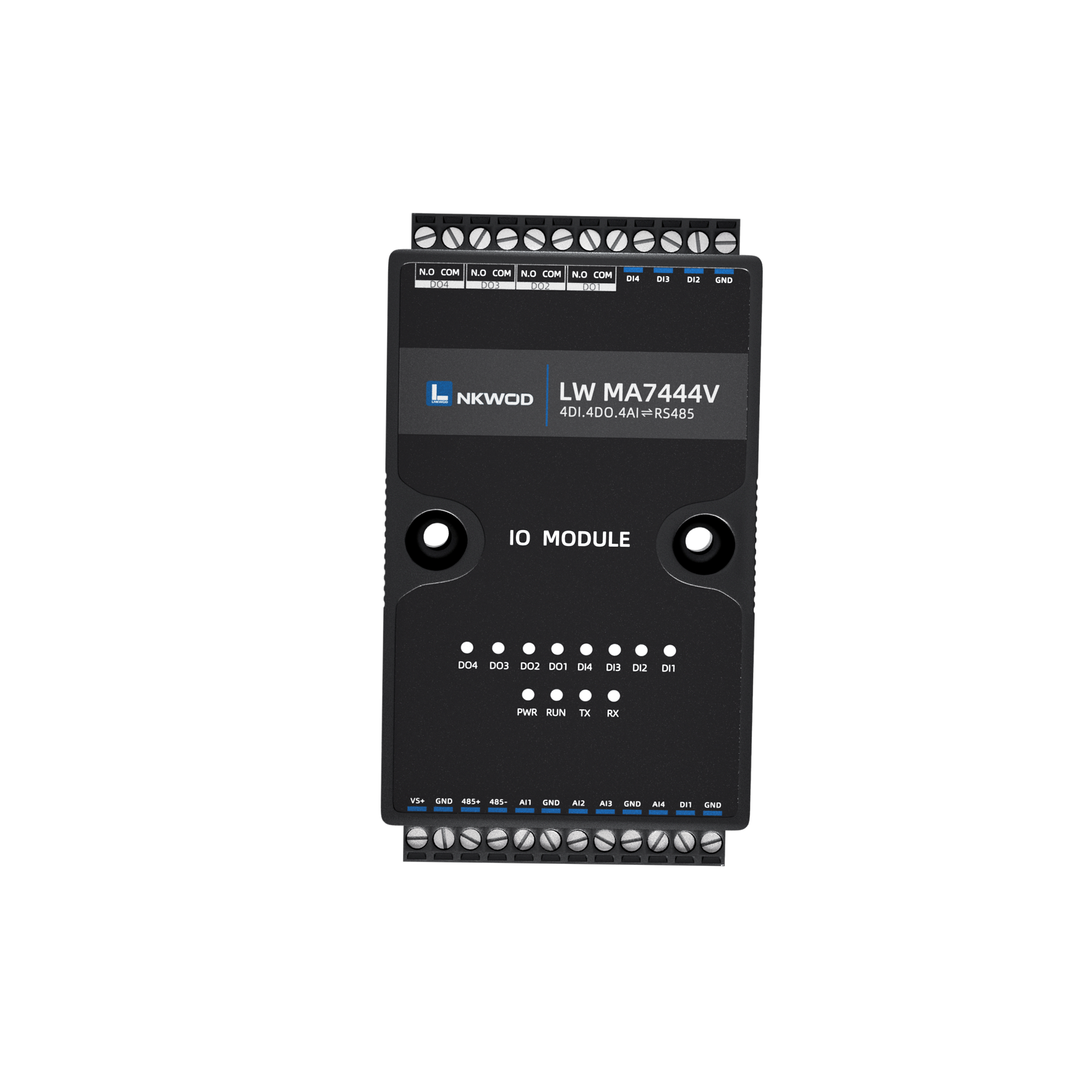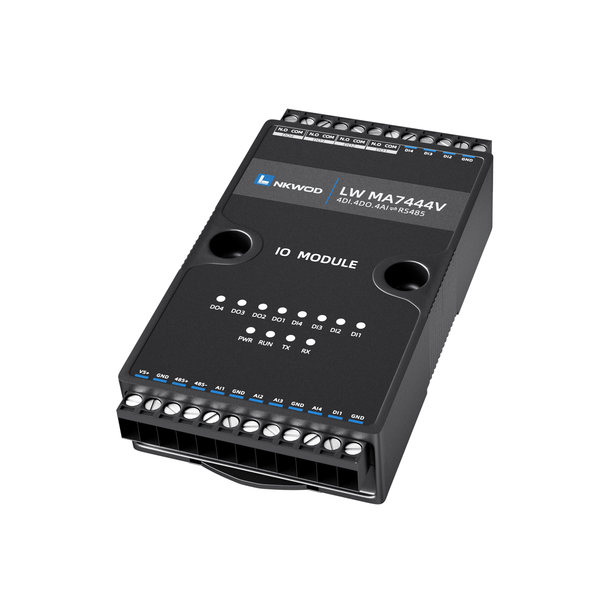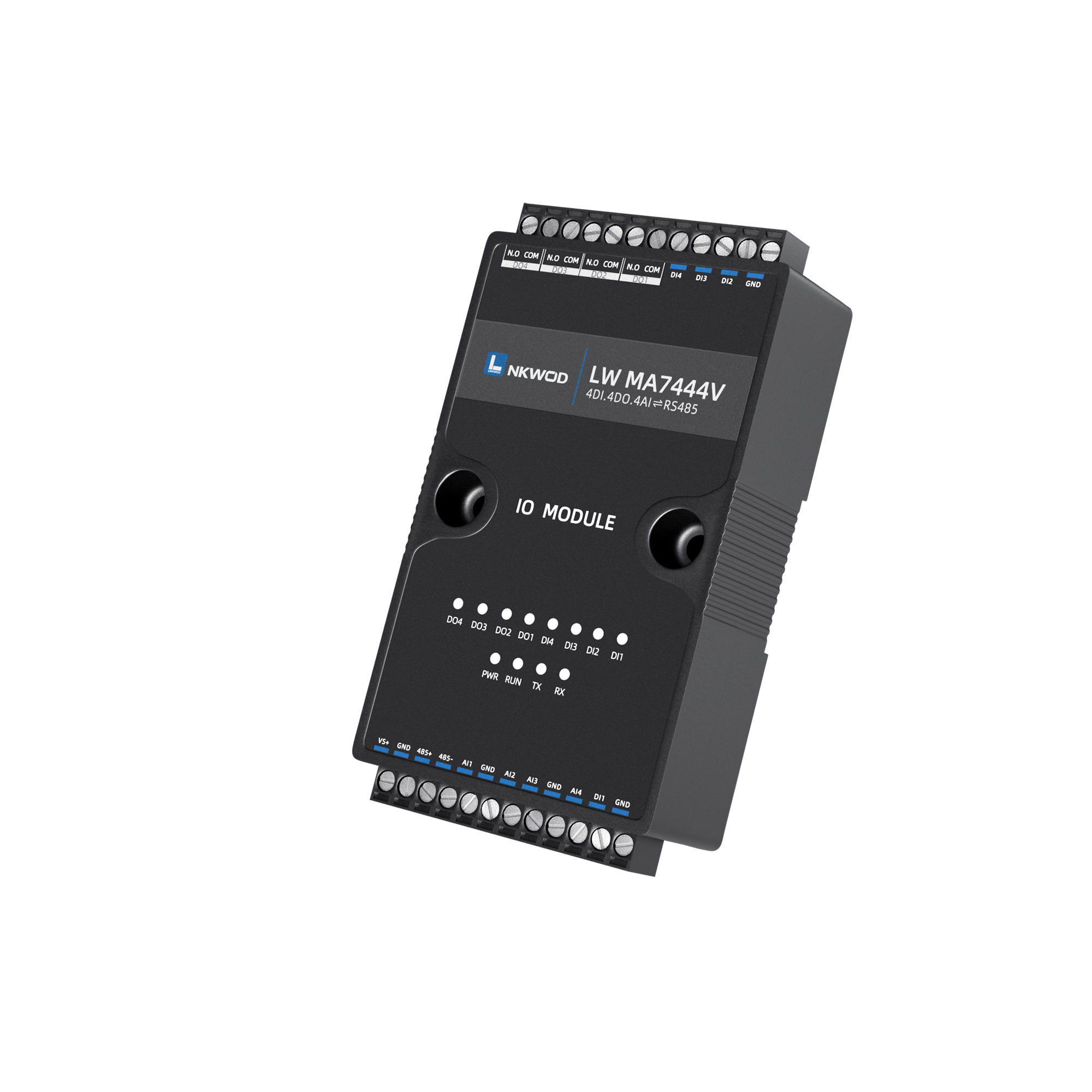 LW MA7444V 为混合型隔离混合智能采集器,具有 4 路干接点数字量输入(DI)和 4 路 A 型继电器输出数字量 (DO),4 路电压型模拟量输入,支持电压(量程为 0~5V/0~10V)两种可配置量程,采用单端输入设计。