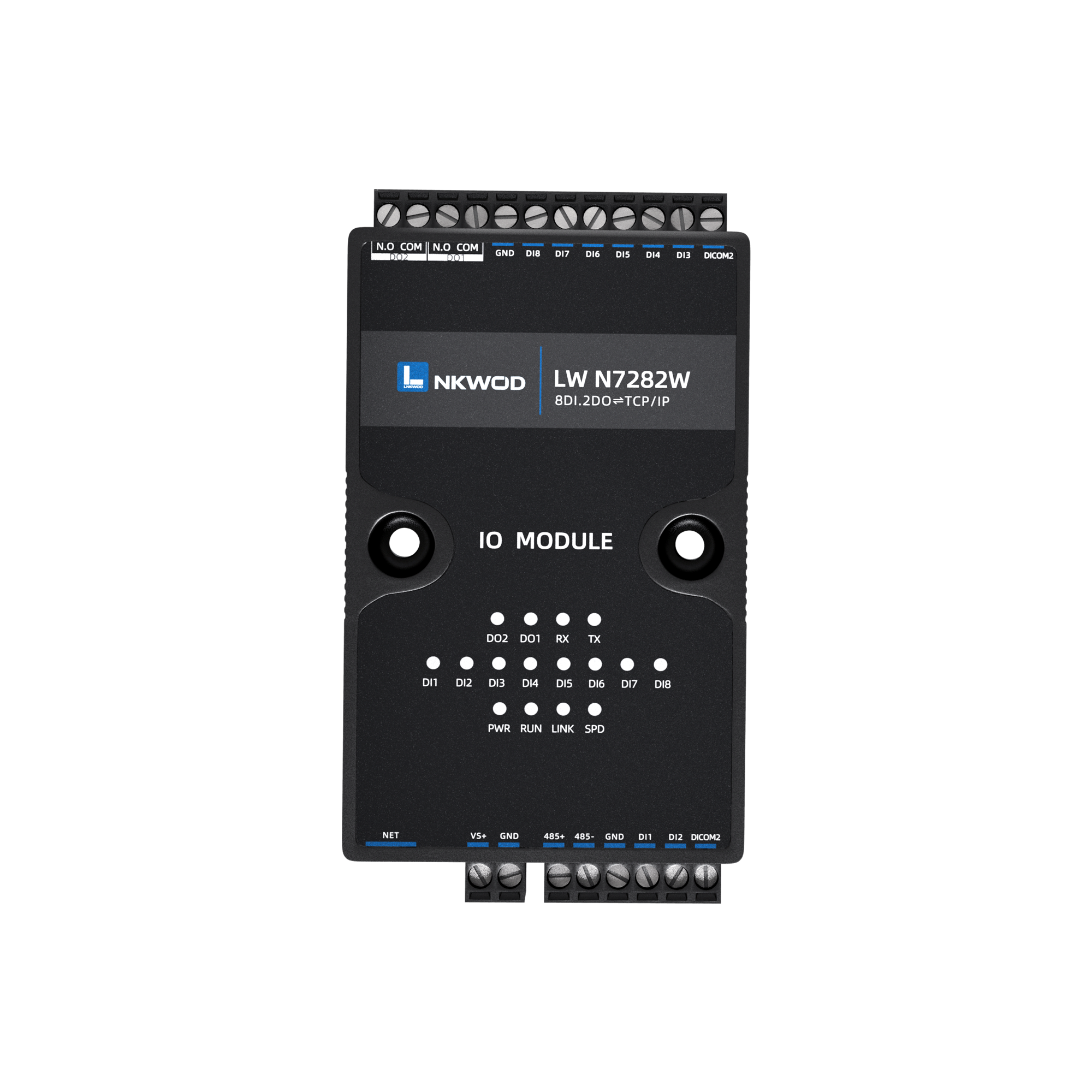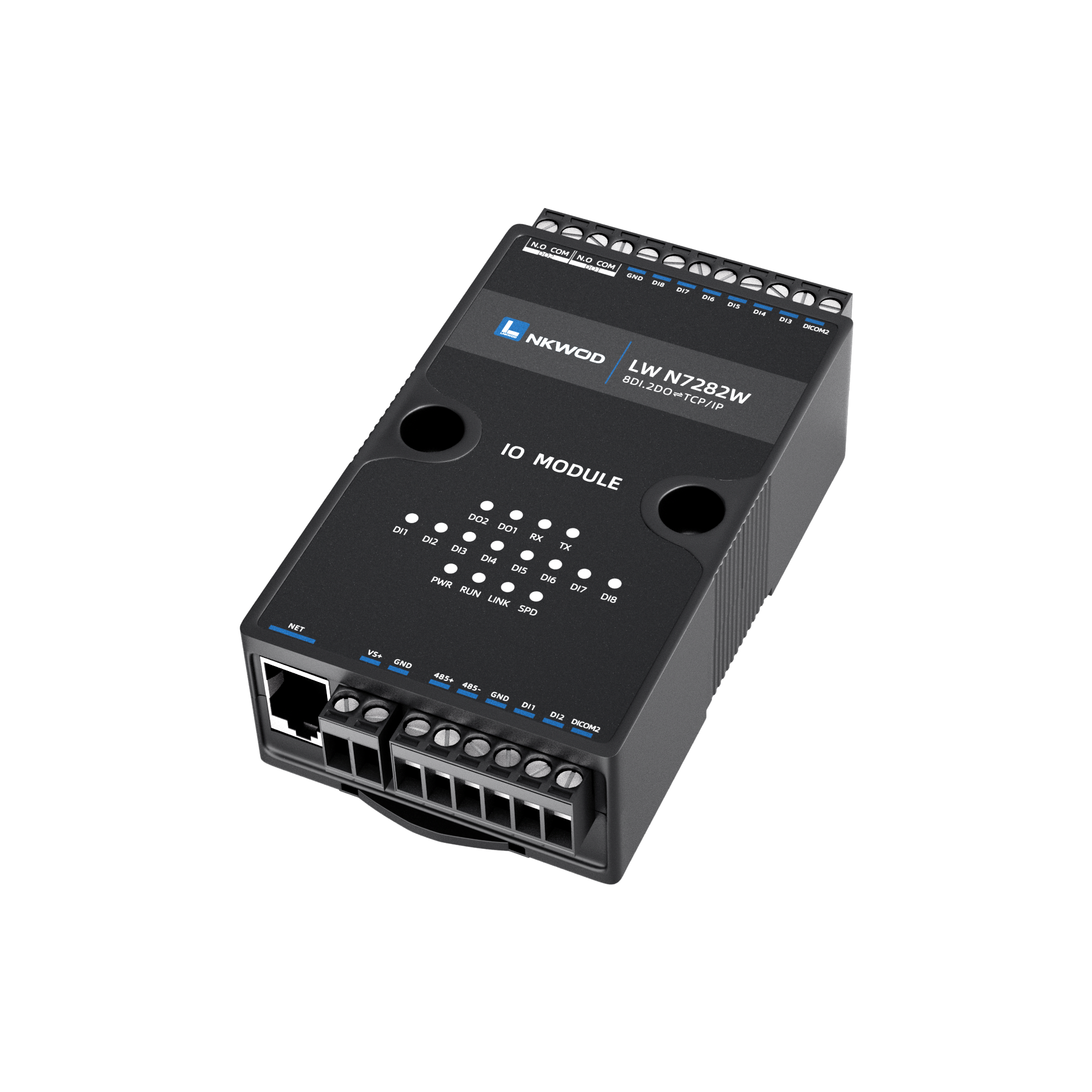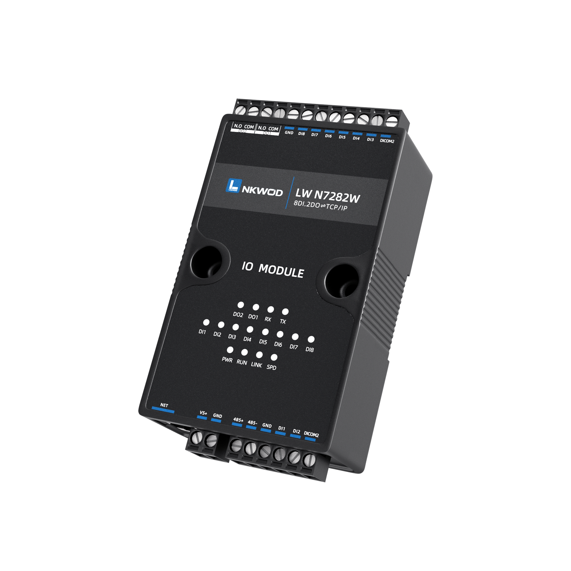 LW N7282W为网络型智能数字量采集器,具有8路干/湿接点数字量输入(DI)和2路A型继电器输出数字量(DO);设备同时带有一个RS485接口,向下级联RS485接口的设备,可以将RS485接口数据转到网络,实现串口和以太网的双向透明传输或Modbus协议传输功能。
