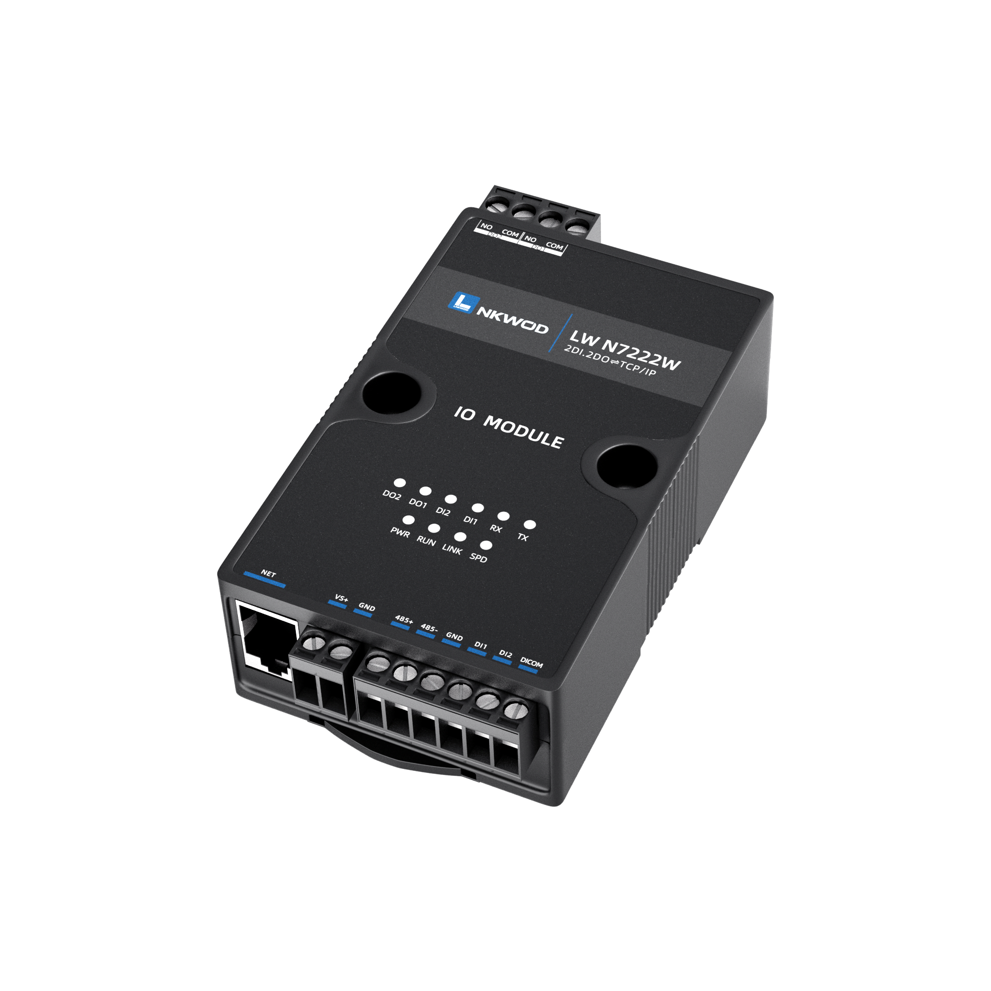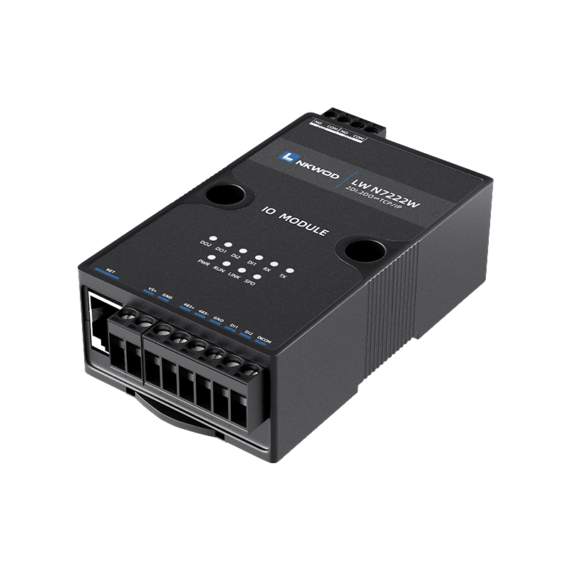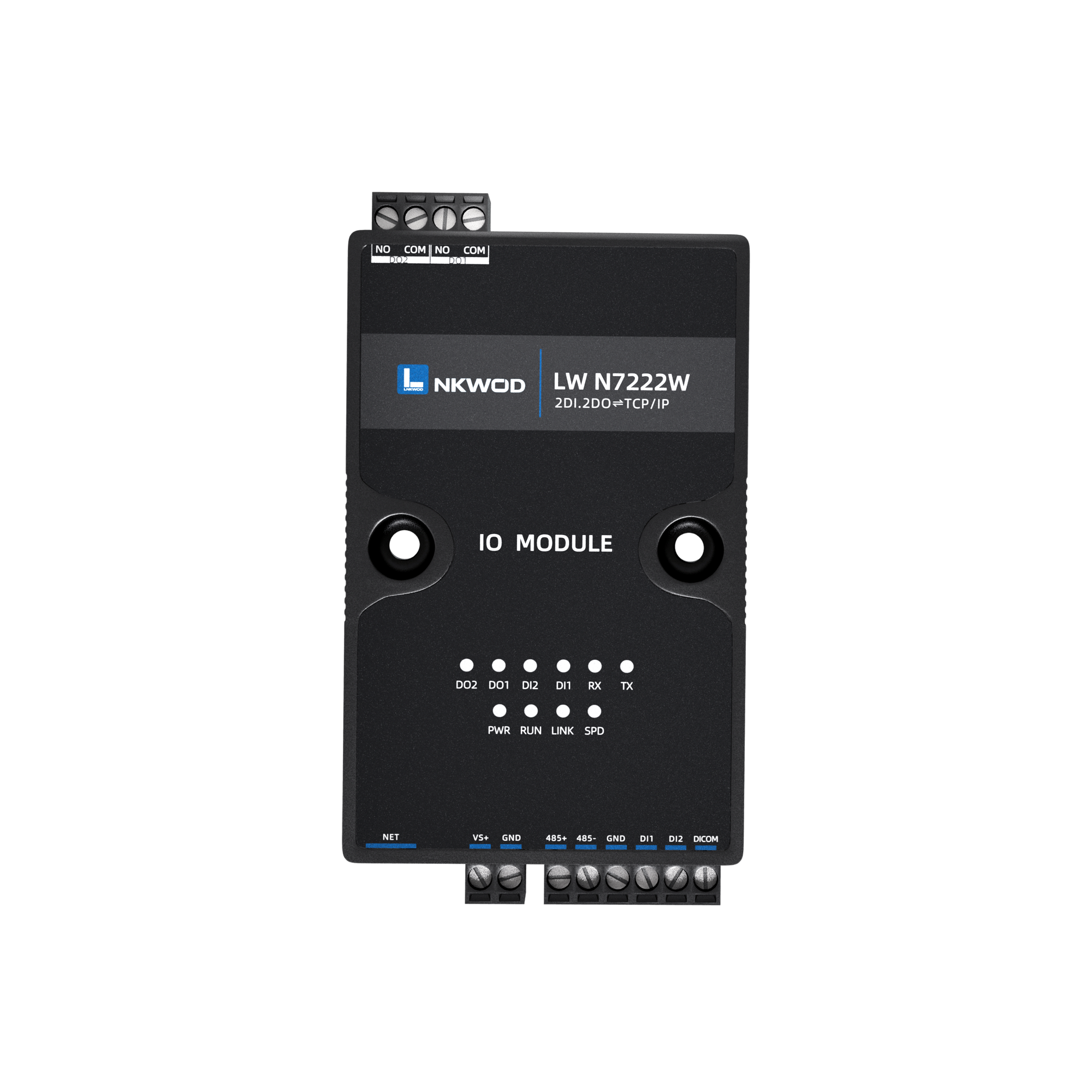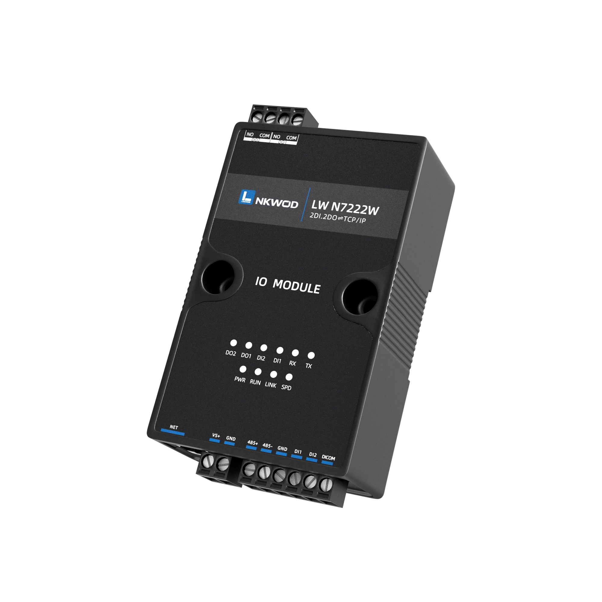 LW N7222W为网络型智能数字量采集器,具有2路干/湿接点数字量输入(DI)和2路A型继电器输出数字量(DO);设备同时带有一个RS485接口,向下级联RS485接口的设备,可以将RS485接口数据转到网络,实现串口和以太网的双向透明传输或Modbus协议传输功能。