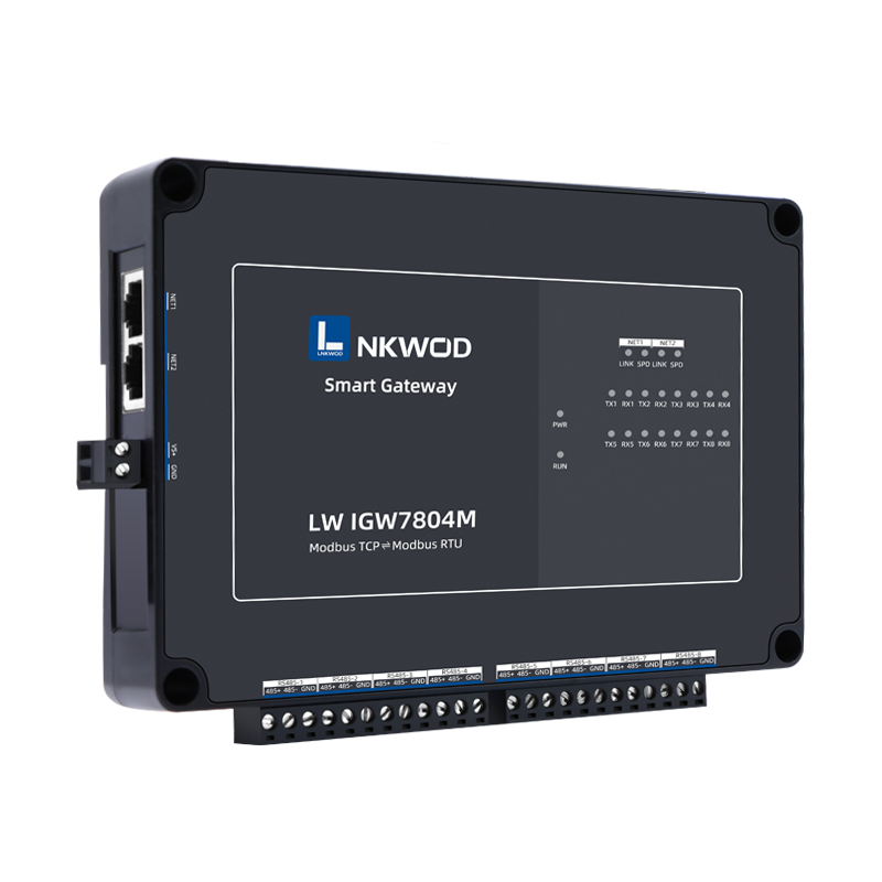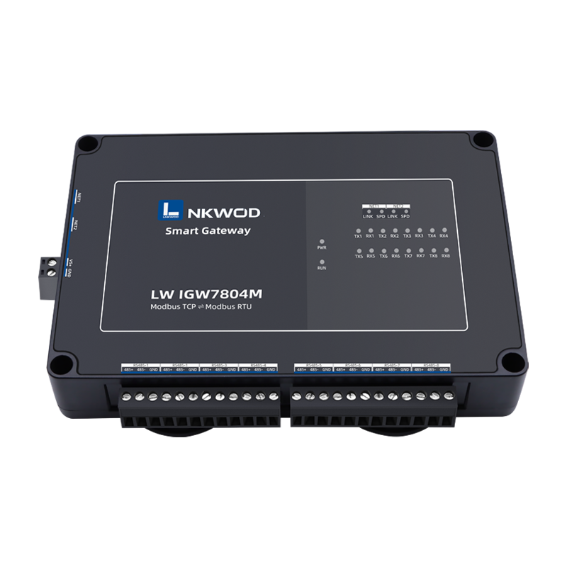 LW IGW7804M 为双网口,八串口(RS485)Modbus 智能网关,专门针对 PLC、HMI 或者组态 软件的采集。传统的 Modbus 网关只是 Modbus TCP 和 Modbus RTU 协议做个转换,网关本身并不主 动采集数据,而 IGW7804M Modbus 智能网关是可以主动采集从站数据并缓存到网关内部,从而上 位机可以通过 TCP 或者 RS485 总线直接从 Modbus 智能网关取数据,这样就减少了上位机主站与从 站的交互次数,极大地提高了采集速度,实时性,可靠性以及稳定性